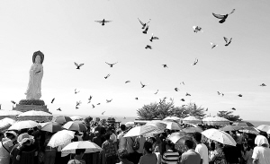 3月27日,社会各界数百人在三亚南山为云南盈江地震与日本地震中的受灾民众祈祷,祝愿他们早日重建家园。图为放飞和平鸽的情形。 本报记者 苏建强 特约记者 陈文武 摄