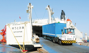 | 青岛近日加强口岸放射性检测,确保入境物资安全。经过放射性检测合格后的集装箱正从日本抵达中国青岛港的客货滚装船“理想之国”号货仓内运出。 新华社发 |