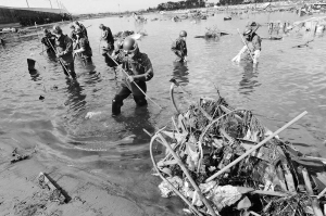3月28日,日本自卫队士兵在宫城县仙台市浅海区搜寻遇难者遗体。 新华社/法新