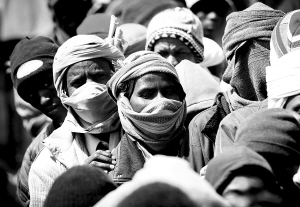 | ↑3月29日,在埃及与利比亚边境的塞卢姆口岸,滞留的难民排队领取埃及红十字会发放的食物和水。在利比亚遭到空袭后,利比亚和埃及边境地区开始出现难民潮。数千名在此滞留的难民搭建简易帐篷或者是席地而眠,靠领取国际组织和埃及红十字会的救助度日。 新华社发 |
