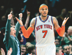 29日,尼克斯队在NBA常规赛中主场以113:106战胜魔术队。图为尼克斯队球员安东尼在比赛中。 新华社发