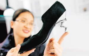 3月29日,在海南国际创意港体验广场和体验中心,工作人员正在展示颇具创意的高跟鞋。据了解,创意港将于4月1日开园试运营,届时市民在体验中心可以观看并购买包括创意农业、创意生活、创意旅游等2000多件新潮的创意主题产品。 本报记者 张杰 摄