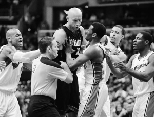 | 3月31日,奇才队在NBA常规赛中以107:123负热火队。图为奇才队沃尔(右三)与热火队伊尔格斯卡斯(右二)发生肢体冲突。 新华社发 |