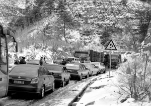 4月2日,车辆拥堵在雪后的山路上。 当日,山西省晋中地区迎来降雪,积雪融化后道路异常湿滑,致使左权至榆次路段出现交通拥堵,给人们出行带来不便。 新华社发
