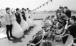 4月2日,“丽星游轮海上婚礼体验之旅”活动在香港尖沙咀海港城码头举行。即将推出的正式海上婚礼将为新人们提供水手情侣套房、海上风情摄影、甲板音乐演奏、海鲜婚宴大餐等一系列配套服务。据悉,香港每年平均55000对新人结婚。 新华社记者 陈晓伟 摄