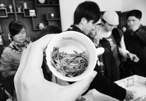 4月2日,参拍者在西湖龙井茶拍卖会现场“品茶”。 当日,在杭州市举行的一场2011年西湖龙井茶拍卖会上,标的物为4号和6号明前西湖龙井新茶每斤被拍出了3.2万元和3.1万元的高价。 新华社发