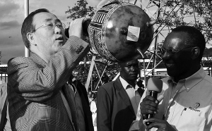 4月2日,联合国秘书长潘基文(左)视察肯尼亚奥卡瑞地热发电站后观赏该发电站赠送的葫芦工艺品。 当天,联合国秘书长潘基文在视察肯尼亚奥卡瑞地热发电站时表示,清洁能源是实现可持续发展的基础,联合国呼吁全球各国加大清洁能源的开发利用,并将为各国开发清洁能源提供一切必要帮助。 新华社/法新