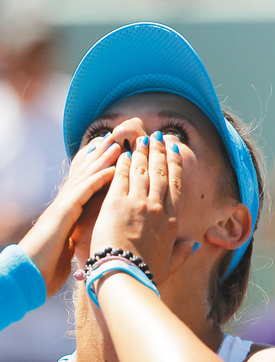 4月2日,在迈阿密网球公开赛女单决赛中,阿扎伦卡以2:0战胜莎拉波娃,夺得冠军。图为阿扎伦卡庆祝获胜。 新华社发