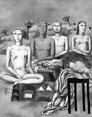 作于1988年的《生生息息之爱》尺幅宏大,代表泥土的黄褐色画面上描绘了多位裸露上身的原始男女,与襁褓中的婴儿、羔羊、鸟兽一起栖身于大自然中。作品表达了对生命力的歌颂,也对生命发出最原始的探索和询问。