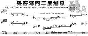 中国人民银行5日晚间宣布,自2011年4月6日起上调金融机构人民币存贷款基准利率。金融机构一年期存贷款基准利率分别上调0.25个百分点。调整后,一年期存款利率达到3.25%,一年期贷款利率达到6.31%。