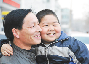 张计虎和儿子小浩楠在一起。今年10岁的男孩张浩楠,是河北省邢台市东大街小学四年级学生,却是一个再生障碍性贫血患儿。父亲为了给他治病每月到血站献一次血。为了给儿子治病,他已欠下8万多元外债。近日,当地媒体报道了这位父亲每月献血拯救重症儿子的事迹,许多爱心人士向小浩楠伸出了援助之手。新华社发