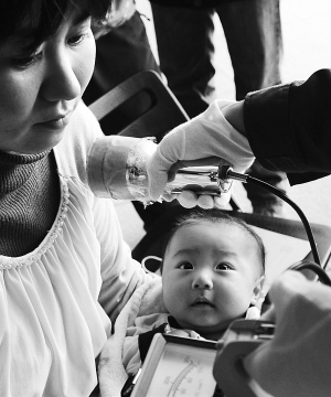 | 在福岛市一处核辐射检测点,一位母亲带着3个月大的孩子在接受检测。新华社发 |