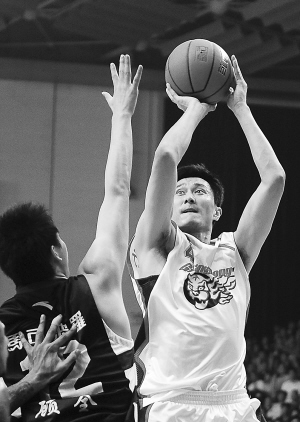 4月6日,在2010-2011赛季中国男子篮球职业联赛(CBA)季后赛半决赛第二回合比赛中,广东东莞银行队主场以123:115战胜东莞马可波罗队。在另一场半决赛中,新疆队主场以112:91轻松战胜江苏队。在五场三胜的比赛中,广东队与新疆队都以2:0领先,拿到赛点。图为广东东莞银行队球员杜锋(右)在比赛中投篮。