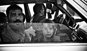 | 4月7日,在利比亚东部城市艾季达比耶,一个女孩跟随父亲乘车时望着窗外。