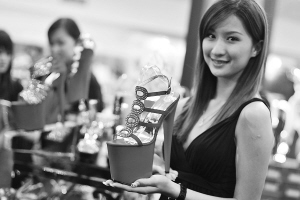 4月7日,在马来西亚首都吉隆坡举行的国际鞋业嘉年华会上,一名销售员展示一只高跟鞋。为期4天的马来西亚国际鞋业嘉年华会当天在吉隆坡举行。该展会预计将吸引超过5万名观众。 新华社发(张纹综摄)
