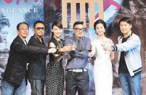 4月7日,导演李仁港、演员张涵予、贾青、陈小春、刘亦菲、黎明(从左至右)出席电影《鸿门宴》的开机仪式。《鸿门宴》由黎明和刘亦菲主演,这部电影将在今年年底的贺岁档公映。 新华社发