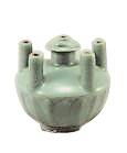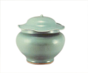中国陶瓷学千百年来追求千峰翠色、如冰似玉的理想境界,在这件荷叶盖罐上得到了完美的展现。展厅中这件荷叶盖罐,是龙泉窑梅子青釉瓷器的代表作品,高31.3厘米、宽23.8厘米、腹径达1米,轻薄如纸的荷叶翻翘着,釉色柔和淡雅,洁净莹泽,温润如春水,耀青流翠,精光内蕴。千年风云,无损光彩容颜。凝视眼前之宝,无异与历史对话。有学者认为荷叶形盖罐有贮酒的功用。