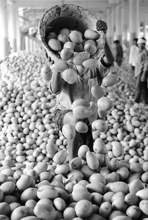 ①一名工人在印度海德拉巴郊区的一座水果市场卸下芒果(2009年4月18日摄)。