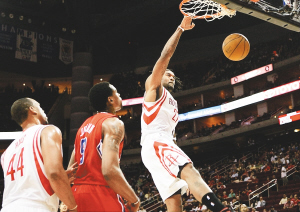北京时间4月10日,在NBA常规赛中,火箭队主场以99:78战胜快船队。图为火箭队球员乔丹·希尔(右)扣篮。新华社发 马刺111:102爵士 奇才115:83老鹰 雄鹿108:101骑士; 掘金130:106森林狼