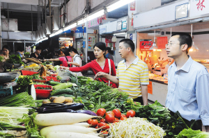 4月11日,广州市民在广州五羊新城一家肉菜市场买菜。 近几天来,广东陆续在莙荙菜、油麦菜、生菜、小白菜等四种蔬菜中检测到极微量的放射性碘-131。11日,记者在广州部分肉菜市场采访发现,这四种蔬菜在市面上销量较平时有所减少,但其他各类蔬菜水果销售如常,市民反应平静。 新华社发