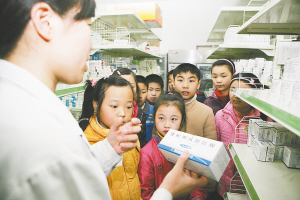 | ← 近日,在湖北襄阳市第一人民医院药房,一名药剂师向小学生介绍常规注射用抗生素类药物。 新华社发 |