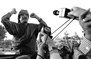 4月10日,利比亚领导人卡扎菲和非盟代表团会谈后对媒体讲话。 新华社/路透 |