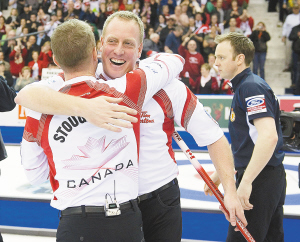 冰壶男子世锦赛 加拿大队问鼎 4月10日,在男子冰壶世锦赛决赛中,加拿大队以6比5战胜苏格兰队,第33次问鼎冠军。图为加拿大队队员古尔德(中)与队友斯托顿拥抱庆祝胜利。 新华社发