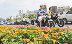 老外游览 鹿城美景 4月11日,两名骑摩托车游览三亚的外国游客驶经迎宾路,对美丽的风光赞不绝口。 本报记者 苏建强 摄