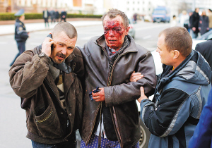 | 救援人员在白俄罗斯首都明斯克的地铁爆炸事件现场看护伤者。 新华社/路透 |