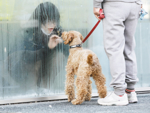 | 在日本二本松,一名疑似遭到放射性物质污染的女孩隔着玻璃与自己的宠物狗打招呼。福岛第一核电站四个机组连续发生的事故是日本地震后影响最大的次生灾害。