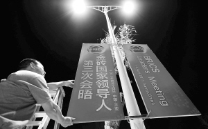 | 4月12日晚,工作人员对三亚装饰横幅进行巡查。 本报记者 王军 摄 |