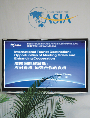 4月19日,博鳌亚洲论坛主题分论坛“金融危机下的国际旅游业”举行。话题关注金融危机下的国际旅游业,同时聚焦海南省正在全力推进的国际旅游岛建设。由海南省政府主办分论坛,这在年会历史上还是第一次。