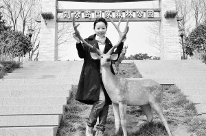4月14日,一位媒体记者在刘公岛国家森林公园门前与梅花鹿雕塑合影。 2008年11月,海协会与海基会在台北举行恢复协商后的第二次会谈。海基会宣布将向大陆同胞赠送梅花鹿、长鬃山羊。2009年底,大陆有关方面确定山东威海刘公岛国家森林公园作为接收梅花鹿和长鬃山羊的地点。台湾梅花鹿“繁星”“点点”和长鬃山羊“喜羊羊”“乐羊羊”将于4月16日正式入住威海刘公岛国家森林公园。 新华社记者邓卫华摄
