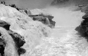 4月12日,游客在观赏“桃花汛”中的壶口瀑布。 每年4月,黄河壶口进入“桃花汛”时期,飞流直下的壶口瀑布景观,成为一年中最美的景色。今年的壶口瀑布,由于气候原因,开河时间较往年延迟10天左右,壶口处无数冰凌顺流而下,如万马奔腾,蔚为壮观。 新华社记者 陶明摄