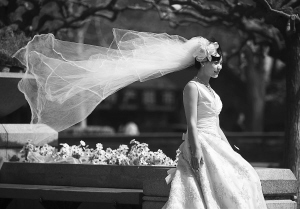 4月14日,王府井教堂前,春风吹起新娘的头纱。 当日,北京日照强烈,最高温达30摄氏度,许多时尚青年已经换上凉爽的夏装,提前感受夏日般的暖阳。 新华社发(李方宇 摄)