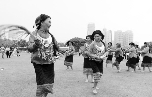 4月13日下午,保亭南茂农场加茂村14位黎族老阿婆在海口市万绿园跳起了“打碗舞”,用黎族加茂方言唱起了祝福歌。据了解,14位七八十岁的阿婆从出生就没走出过大山,最大的心愿是到省城海口逛逛,见证人们描述的美丽海口。在农场干部的带领下,她们终于圆了多年的美梦。 本报记者 苏晓杰 摄