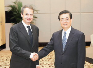 胡锦涛表示,西班牙是欧盟重要国家。中方高度重视发展中西关系,愿同西方一道努力,推动两国交流合作不断深化,更好服务于各自经济社会发展,更好造福两国人民。双方应该重点做好以下工作。一是巩固政治互信。保持高层交往,密切政府、立法机构、政党、地方交流,加深相互理解和信任。二是扩大互利合作。充分发挥两国经贸混委会、行业协会等机制作用,努力扩大贸易规模,推动贸易和投资便利化,通过加强合作逐步实现双边贸易平衡发展。深化风能、太阳能等新能源及电信、基础设施建设领域投资和技术合作。共同开发第三方市场,努力实现互利共赢。三是加强人文交流。扩大双向语言教学规模,积极拓展双方文化、旅游合作。四是密切国际合作。加强在联合国改革、气候变化、金融稳定等问题上的磋商和合作,继续在各自关切的重大问题上相互给予理解和支持。中方赞赏西班牙为稳定金融和恢复经济增长作出的努力。