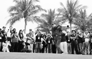 4月14日上午7点,博鳌亚洲论坛高尔夫邀请赛举行开杆仪式,图为博鳌亚洲论坛理事长福田康夫挥杆的精彩时刻。 本报记者 张 杰 摄
