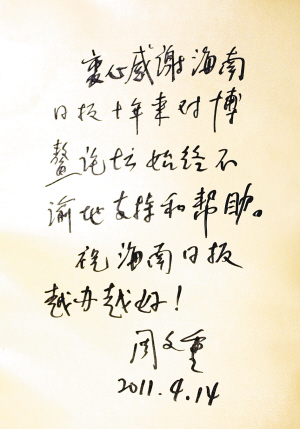 周文重欣然提笔为本报题词:“衷心感谢海南日报十年来对博鳌论坛始终不渝地支持与帮助。祝海南日报越办越好。”