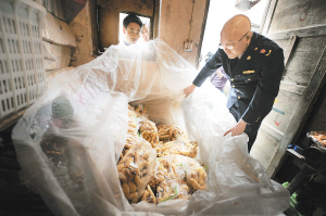 4月15日,湖北省宜昌市万寿桥工商所执法人员查获两个使用硫磺熏制“毒生姜”的窝点,现场查获“毒生姜”近1000公斤。据工商执法人员介绍,不良商贩将品相不好的生姜用水浸泡后,使用有毒化工原料硫磺对其进行熏制,使正常情况下视觉不够美观的生姜变得娇黄嫩脆。 新华社发