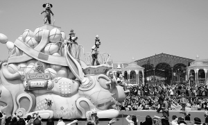 →游客在日本东京迪斯尼乐园观看花车游行。4月15日,因日本大地震关闭了约一个月的东京迪斯尼乐园恢复营运。恢复营运后,迪斯尼将实施多项措施以节约能源。 新华社发