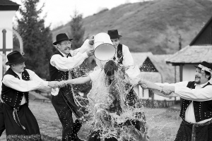 4月14日,在匈牙利北部的霍洛克村,身着民族服装的当地男子向姑娘身上尽情泼水。 被列入世界文化遗产名录的霍洛克村的居民至今沿袭传统习俗向姑娘身上泼水,以迎接复活节。新华社发