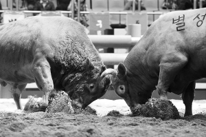 4月15日,在韩国庆尚北道清道郡,名为“别诚”的牛(右)和名为“泰山”的牛在激烈搏斗。 当日,为期5天的2011清道斗牛节在韩国庆尚北道清道郡开幕。 新华社发