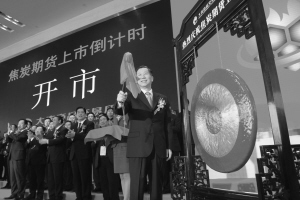 4月15日,尚福林为开市鸣锣。 当日9时,焦炭期货在大连商品交易所开市交易。中国证监会主席尚福林同大连市委书记夏德仁共同为焦炭期货揭幕,尚福林为开市鸣锣。焦炭首日上市的基准价为每吨2180元,开盘2分钟后,首个焦炭合约最高成交价格达到每吨2300元。 新华社发