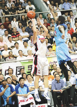 CBA总决赛首轮 广东负于新疆队 4月15日,广东队球员朱芳雨(左)在比赛中投篮。当日,在2010-2011赛季中国男子篮球职业联赛(CBA)总决赛第一回合比赛中,广东队主场以92:100不敌新疆队。 新华社发