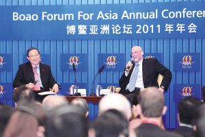| 4月15日,博鳌亚洲论坛秘书长周文重对话美国前财长保尔森。 本报记者 张杰 摄
