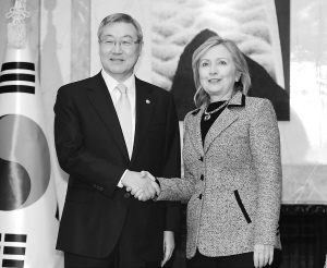 4月16日,美国国务卿希拉里·克林顿(右)在韩国首尔与韩国外交通商部长官金星焕握手。双方一致认为,重开六方会谈首先应由韩国与朝鲜就无核化问题举行对话。 新华社/路透