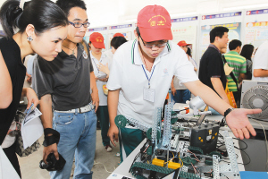 4月16日,第23届省青少年科技创新大赛在省图书馆开幕,共有各市县、省属学校的26支代表队参赛。图为海南华侨中学学生在介绍他们发明的“灾后多功能红外线搜救装置”。 本报记者 苏晓杰 摄