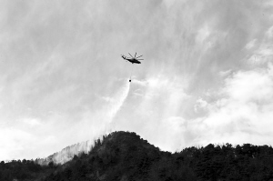 4月17日,一架直升机在洒水扑灭余火。 当日,记者从秦皇岛“4·12”森林大火扑救工作指挥部获悉,经过1万多名部队官兵和当地干部群众5天5夜奋力鏖战,到今天下午17时, 火场内明火已基本扑灭,目前正在清理现场,消灭余火,取得阶段性胜利。 新华社发