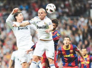 17日,在西甲联赛中,皇马1:1平巴萨。图为皇马佩佩与巴萨球员争顶。 新华社发